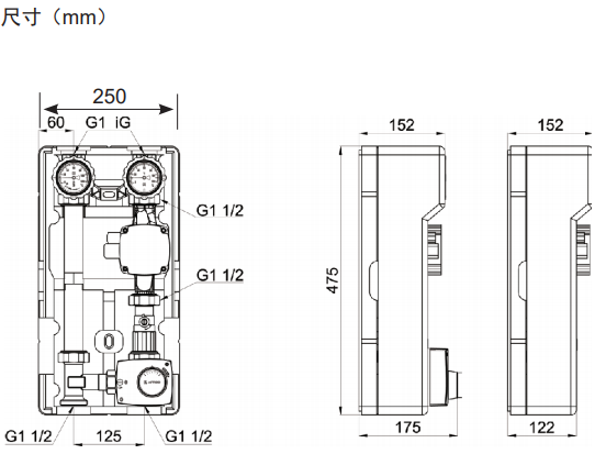 閥門帶溫度計、內置止回閥、高效節能循環泵、三通比例混水閥、電動執行器調節 |