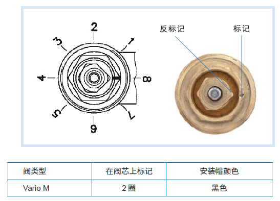 恒溫閥通過調(diào)節(jié)鑰匙ES-SV 進?手動調(diào)節(jié)。用調(diào)節(jié)鑰匙旋轉(zhuǎn)閥芯, 調(diào)節(jié)鑰匙有刻度1~8,將刻度8 對齊參考點( 如右圖)。 從刻度8 開始調(diào)節(jié)(8= 全開),每轉(zhuǎn)1/8圈對應(yīng)一個流量特性。
